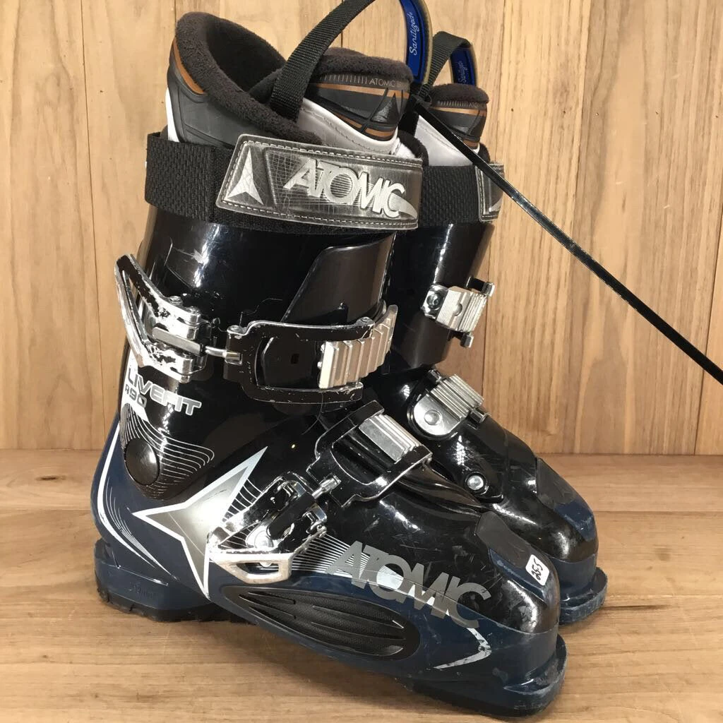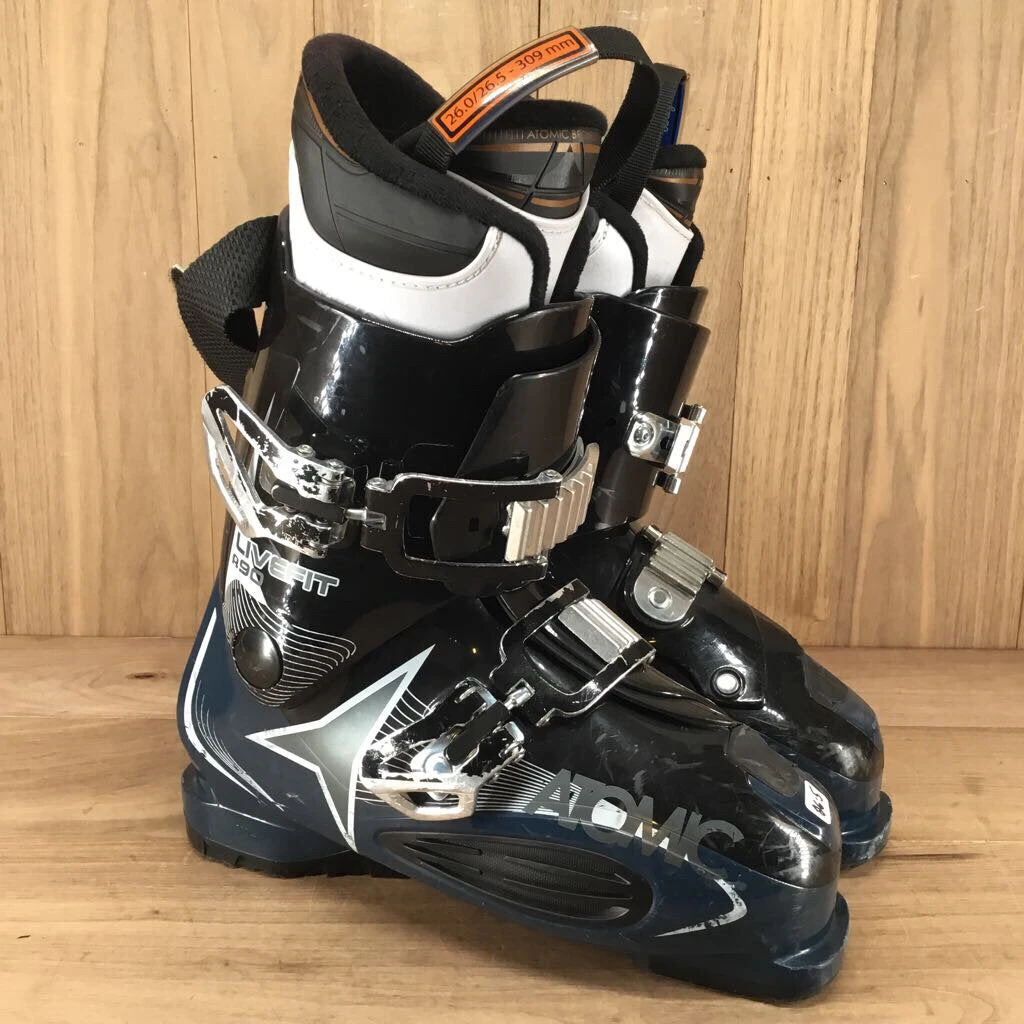Atomic Live Fit R 90. This is great fitting boot with two large buckles and an oversized power strap. Perfect for the beginner to intermediate skier who intends to improve and wants a comfortable boot that will not limit skier progression. The 90 flex is appropriate for most. Its a bit wider. Easy on and off. Lots of life left in this used boots. The boot you get shipped might not be the exact boot in the photo. It will be the same make and model and color.