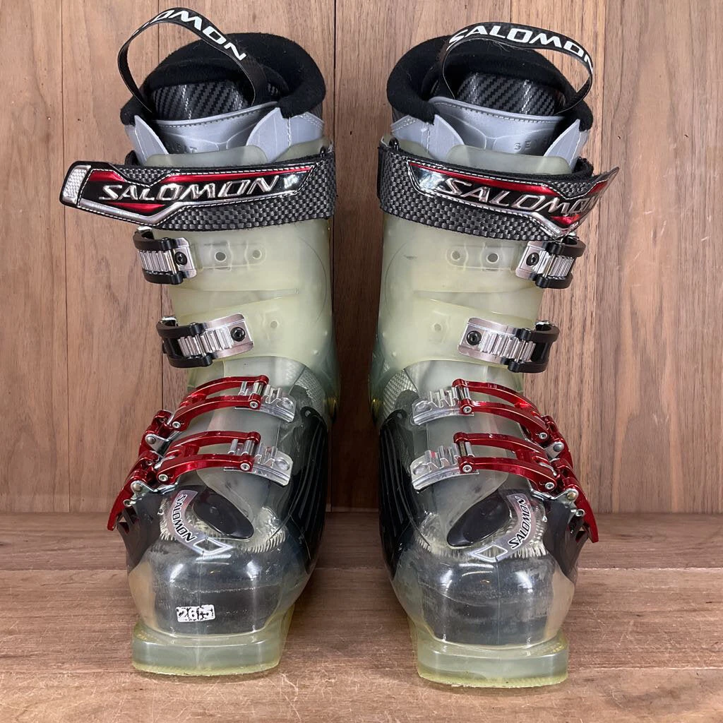 SKU: ski-boots-6701724205140 Categories: Ski, Ski Boots, Winter Gear Tags: 26.5, Black/Clear, Depth: 6, Height: 21, Lone Pine Gear Exchange, Salomon, Used, Width: 15